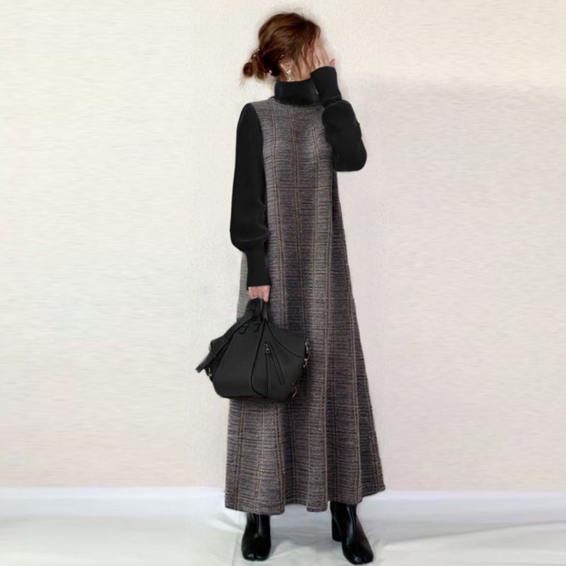 【単品注文可】チェック柄 ラウンドネック セーター+ ハイウエスト 無地 スカートセット