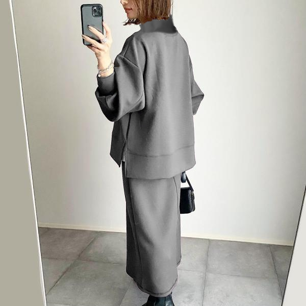 高見えデザイン ファッション ラウンドネックトップス+無地 スカート 二点セット