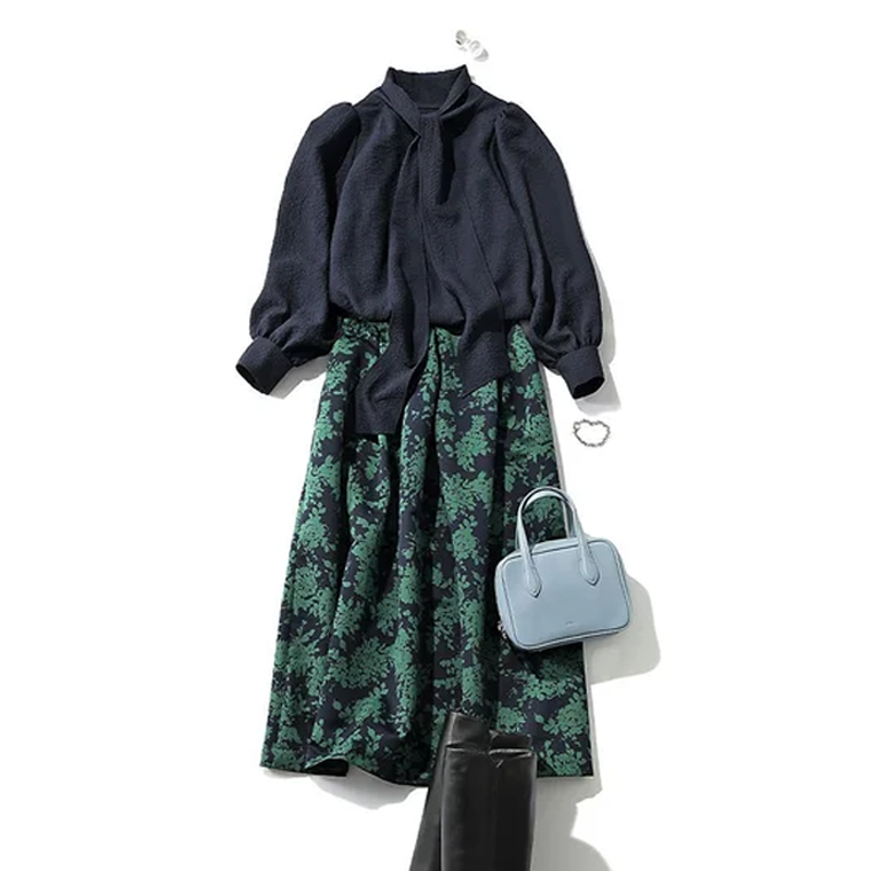 【再入荷予定】女っぽさが漂う ボウタイランタンスリーブシャツ+プリントスカート2点セット