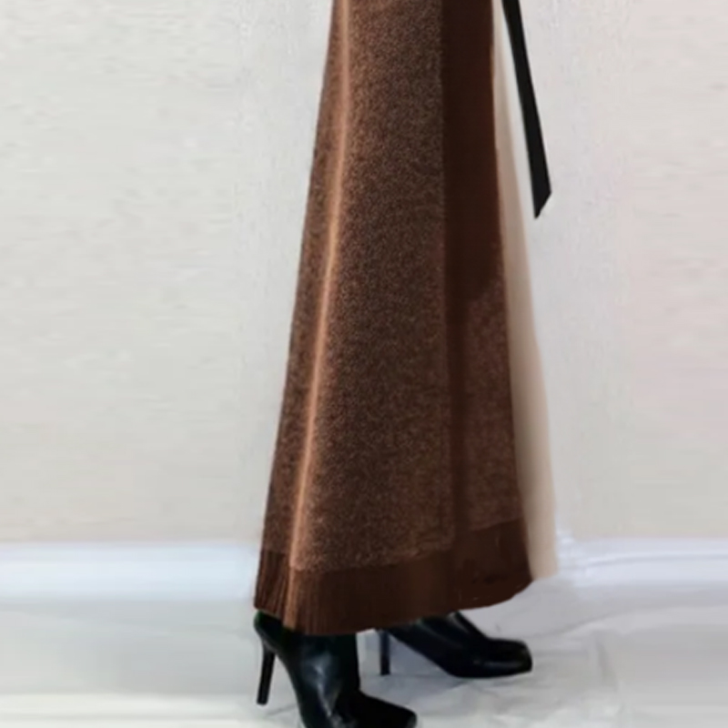 レディース 秋冬 Vネック ブラウン ベルト付き ギャザー 配色 カジュアル ニットワンピース