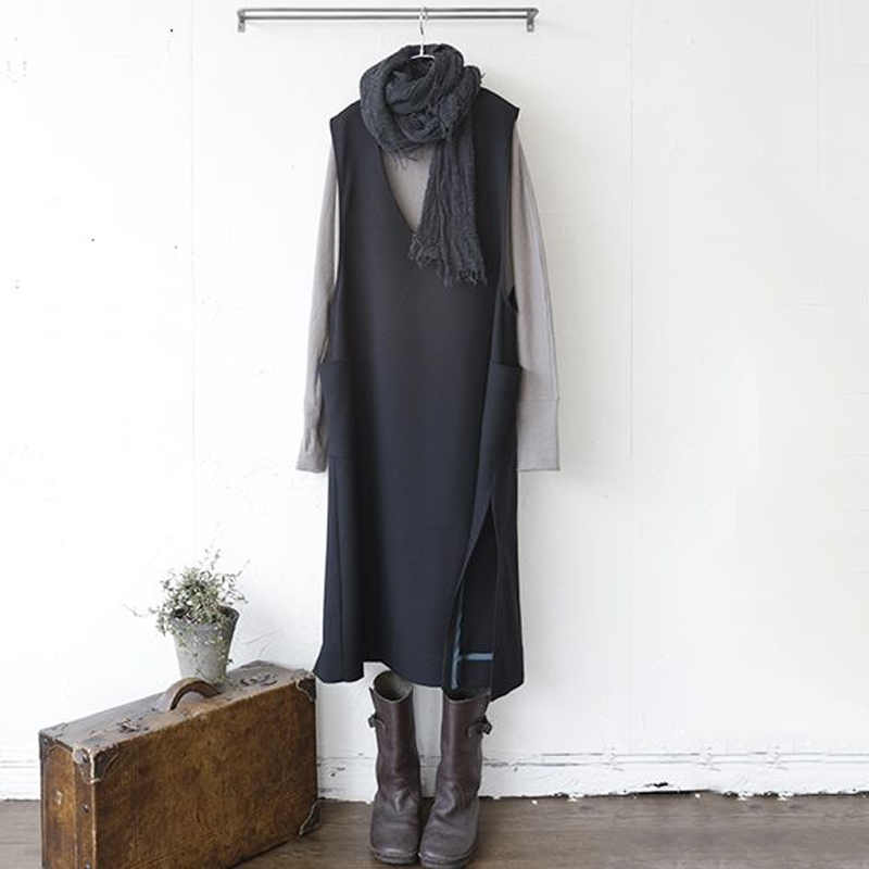 ノースリーブ レディース 秋冬 スリット ポケット付き シンプル プランジングネック カジュアルワンピース