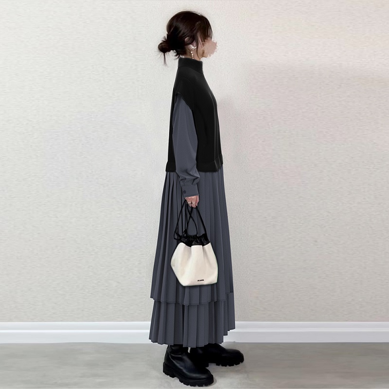 シンプル ファッション 無地 ハイネック プルオーバー トップス+ メッシュ スカート 2点セットアップ