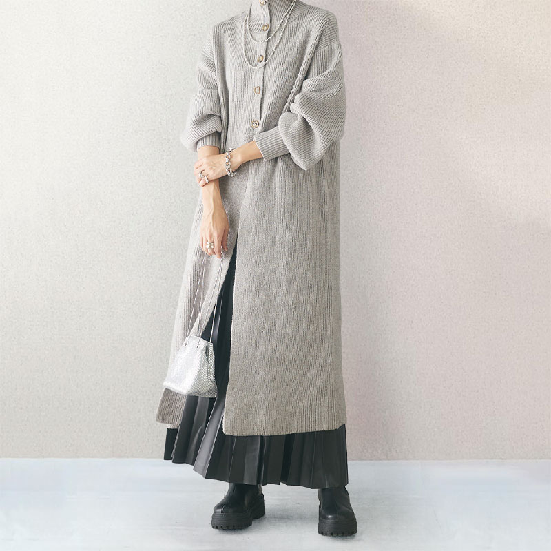 無地 ラウンドネック シングルブレスト ニット+スカート 2点セットアップ