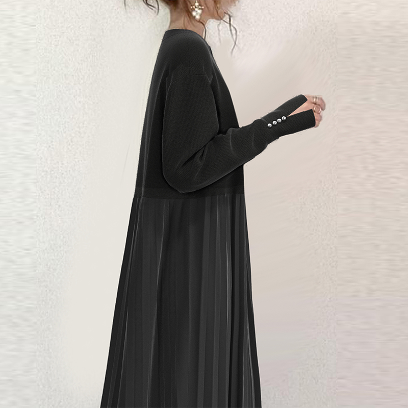 好感度UP シンプル スリット 配色 長袖 ラウンドネック プリーツ カジュアルワンピース
