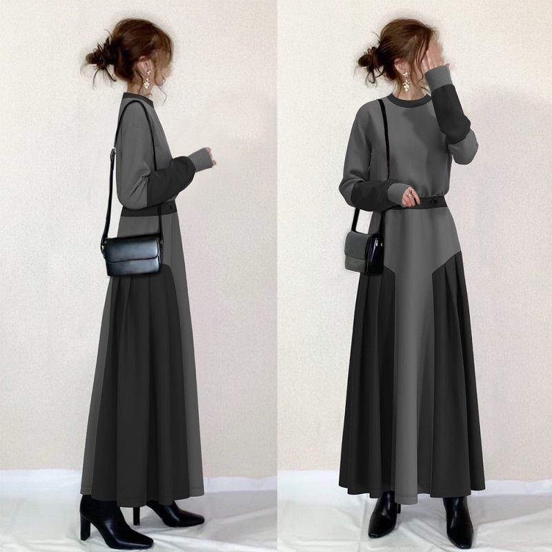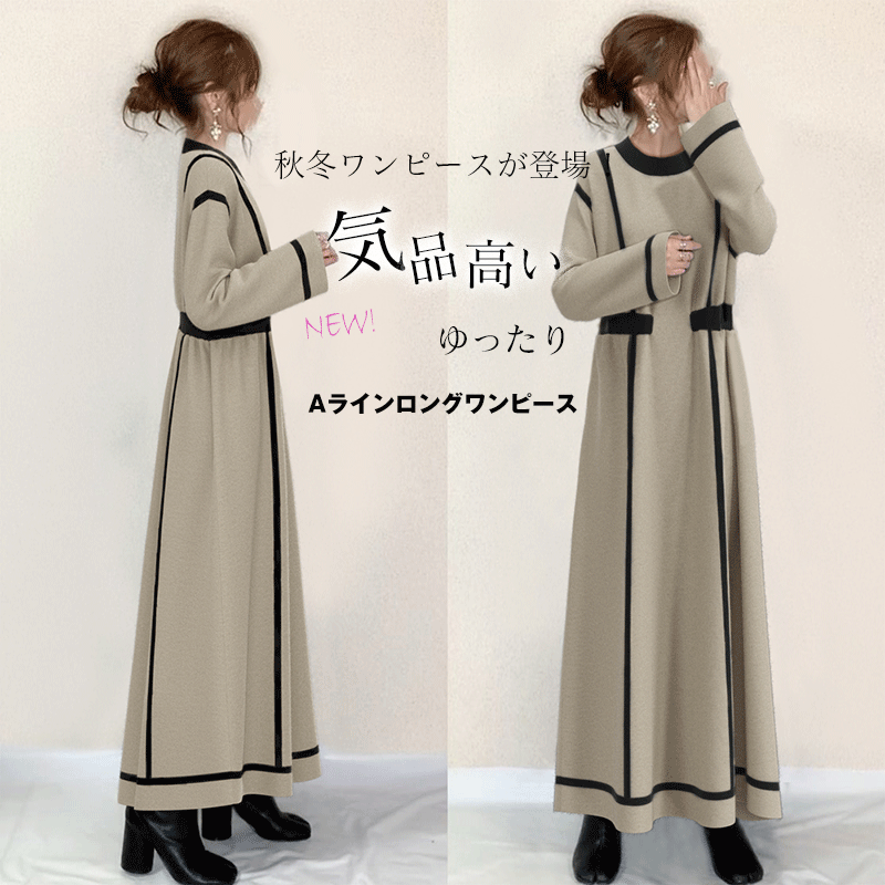 ラウンドネック 配色 ギャザー ハイウエスト Aライン シンプル 秋冬 レディース カジュアルワンピース
