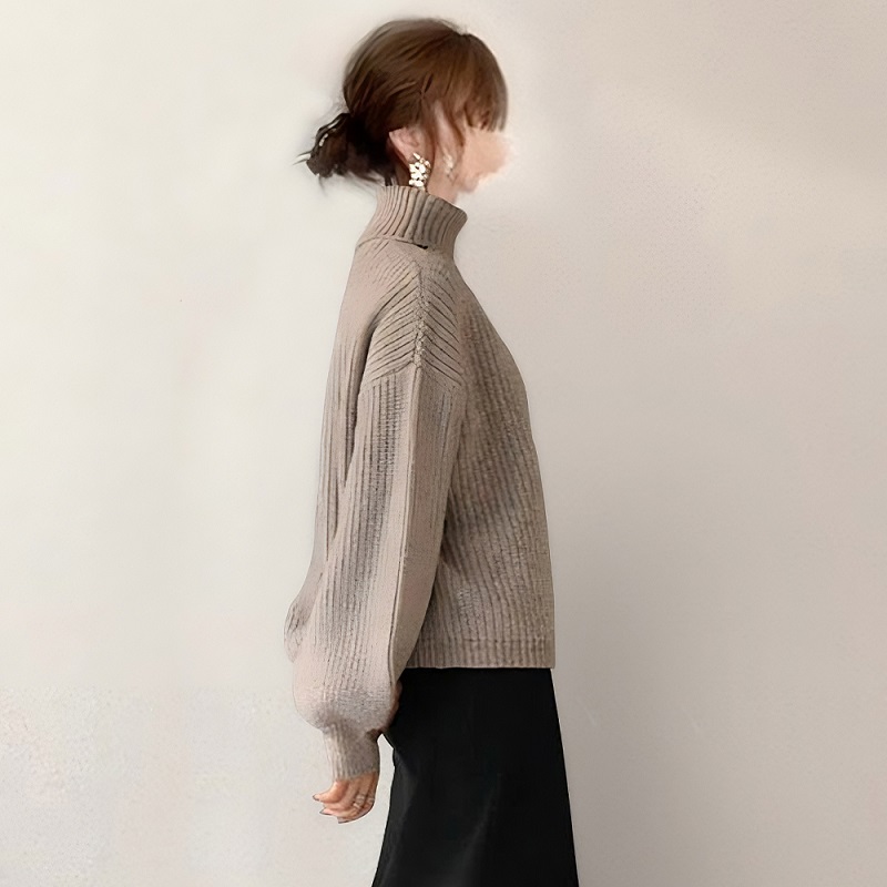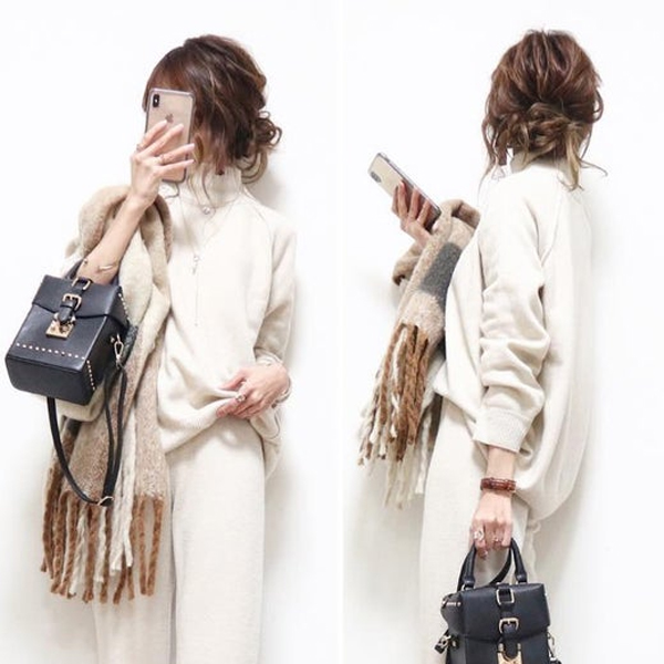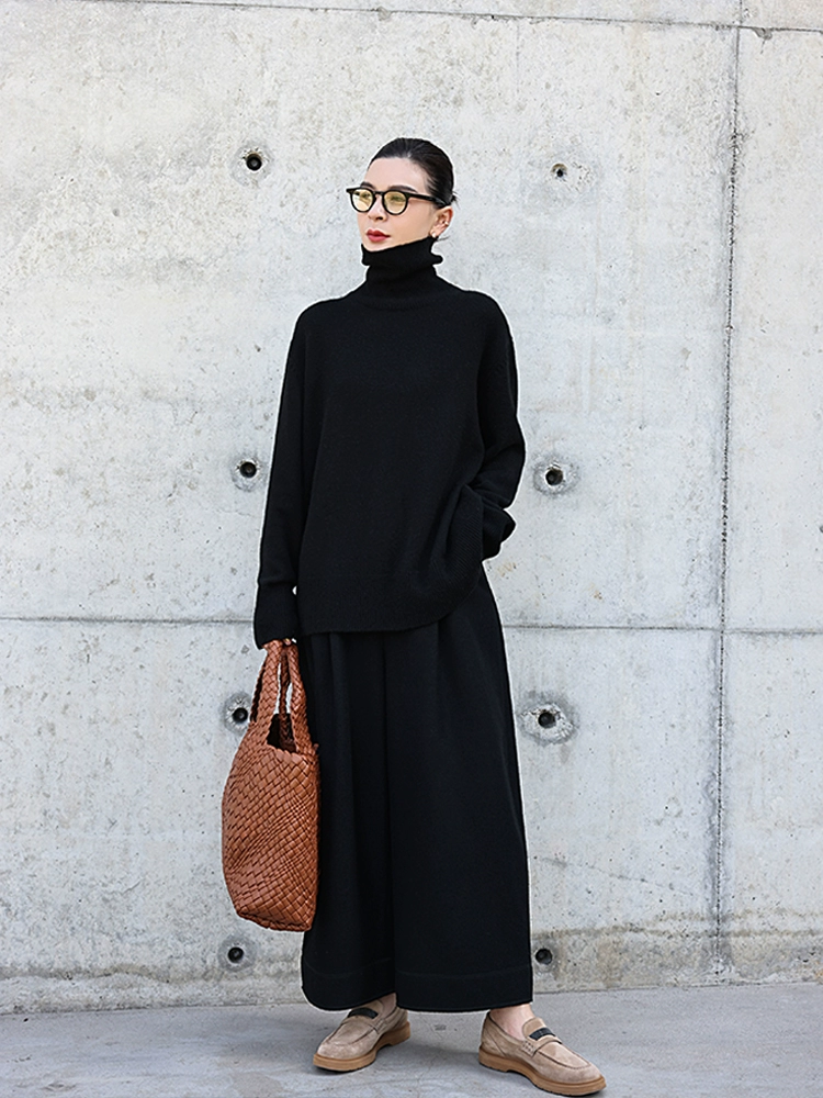 二点セット おしゃれ度高め 無地 柔らかい 厚手 ハイネック ランタンスリーブ セーター+ファスナー スカート セットアップ