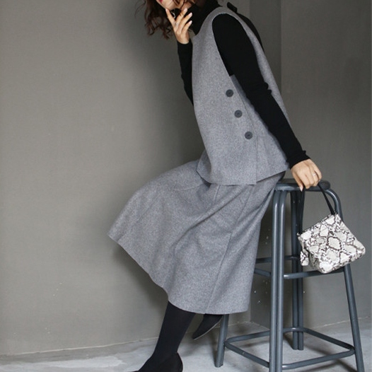 「コーディネート自在」ラウンドネック 秋冬 ボタン スリット ファッション 上品見え ノースリーブ ベスト