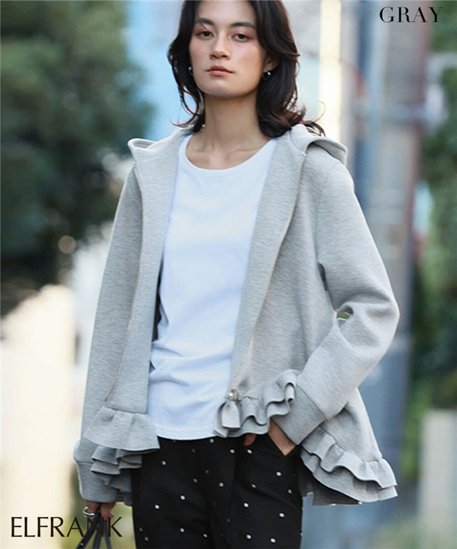 日本海外直邮2024春季女装代购甜美连帽褶边花边下摆休闲卫衣外套【预售 7天发货】