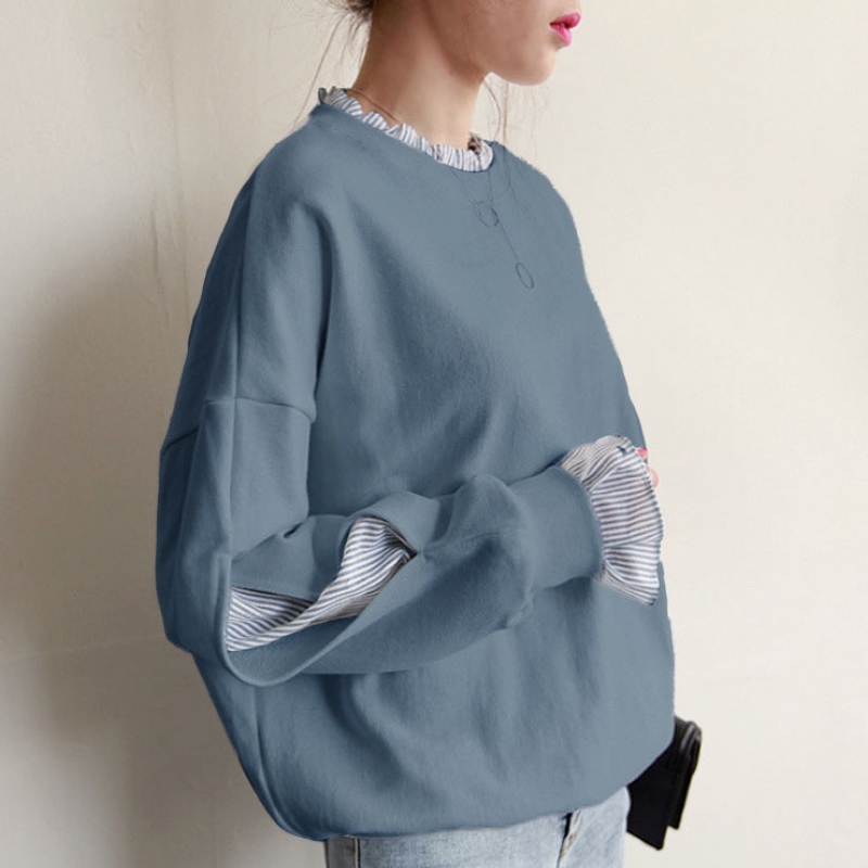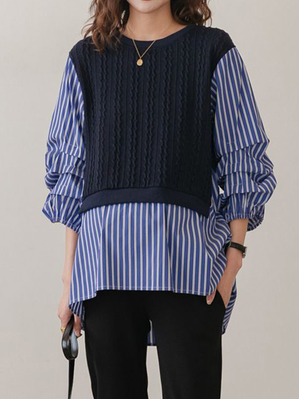 「ストライプ柄」レイヤード / 重ね着風 ラウンドネック 長袖 切り替え パーカー