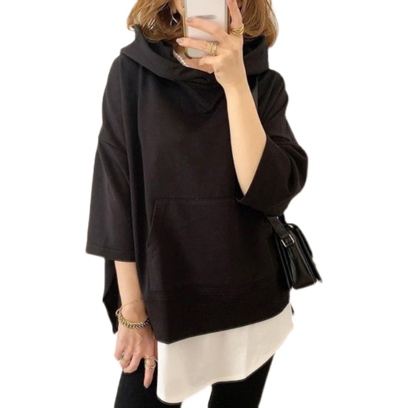 「レイヤード 」フード付き 切り替え プルオーバー ブラック カジュアル パーカー