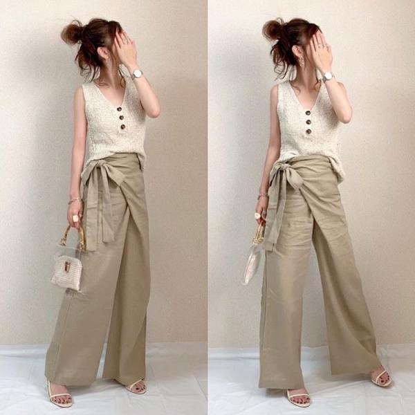 「ボタン」 釦付き ノースリーブ Vネック ハイウエスト カジュアルセット