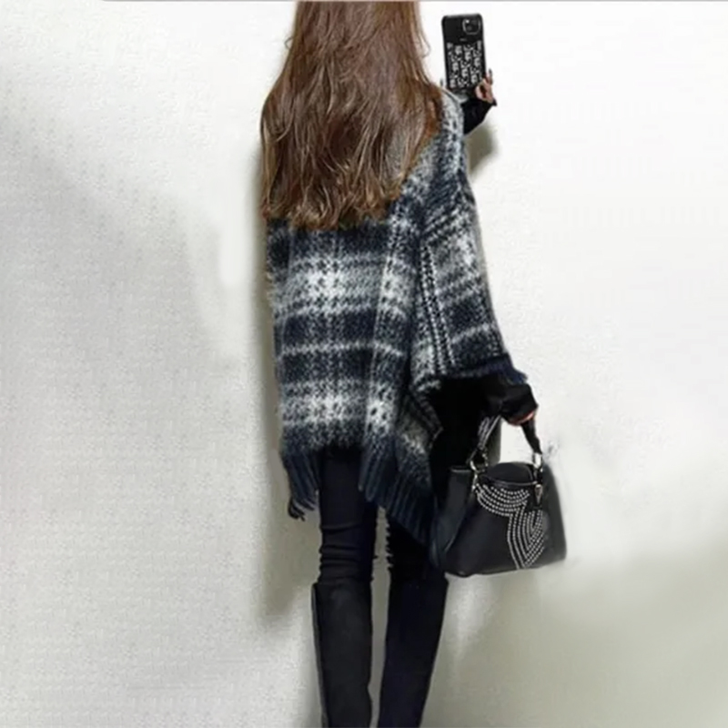 「オフタートルネック」ランダムティアード ドルマンスリーブ チェック柄 秋冬 七分袖 カジュアル ナチュラル ニットセーター