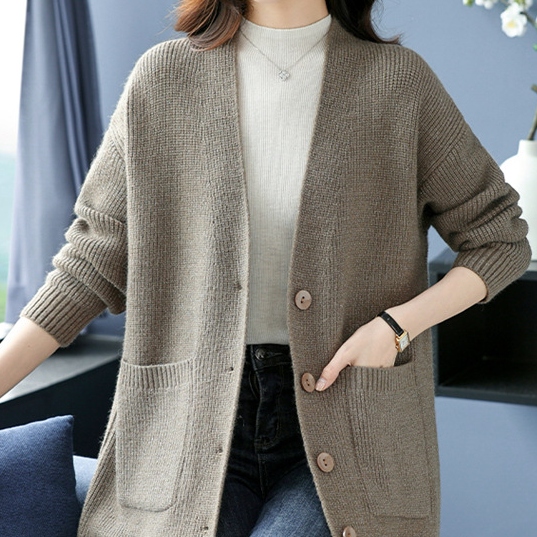 「ファッショナブル 」アンプルライン シンプル レディース シングルブレスト Vネック ボタン 大きめのサイズ感 カーディガン