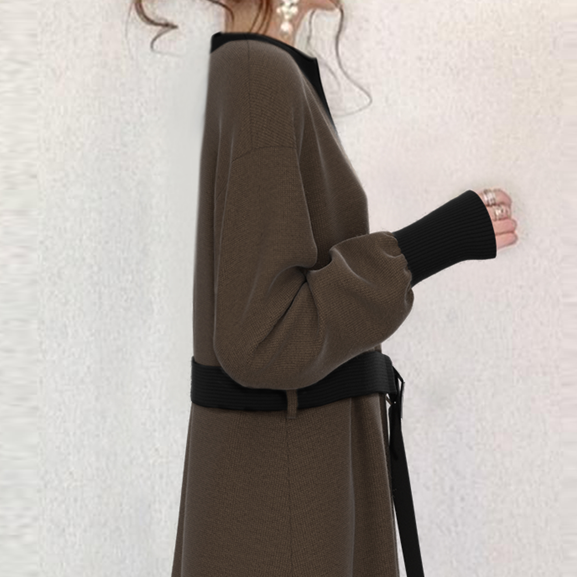 「Aライン」ハイウエスト 配色 Vネック 秋冬 ベルト付き カジュアル シンプル ナチュラル 長袖 ニットワンピース