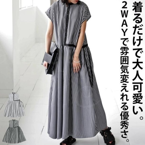【ワンピース】蒸れなく快適 ストライプ柄 Aライン シャツワンピース