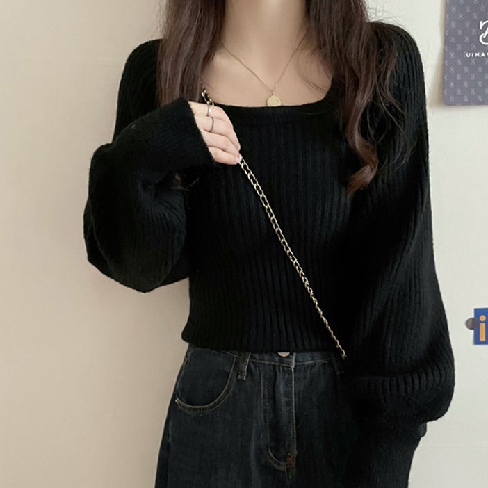 「柔軟加工」 無地 耐久性 ランタンスリーブ ビックシルエット スクエアネック ニットセーター