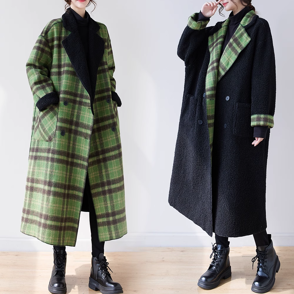 「チェック柄」デュアル 防寒 体型をカバー ファッション レトロ ボタン ダブルブレスト 折り襟 コート