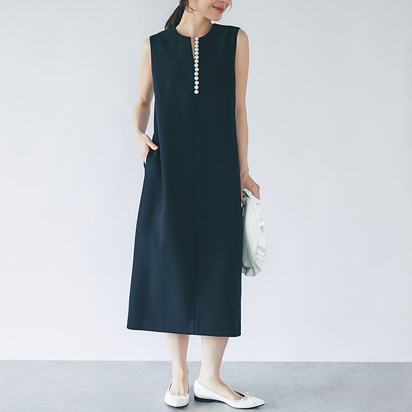 Vネックノースリーブ無地接触冷感体型をカバーOL通勤ワンピース