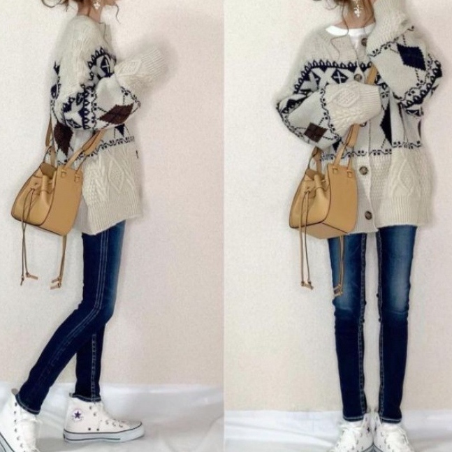 「切り替え」幾何模様 大きめのサイズ感 ショート丈 レトロ セーター
