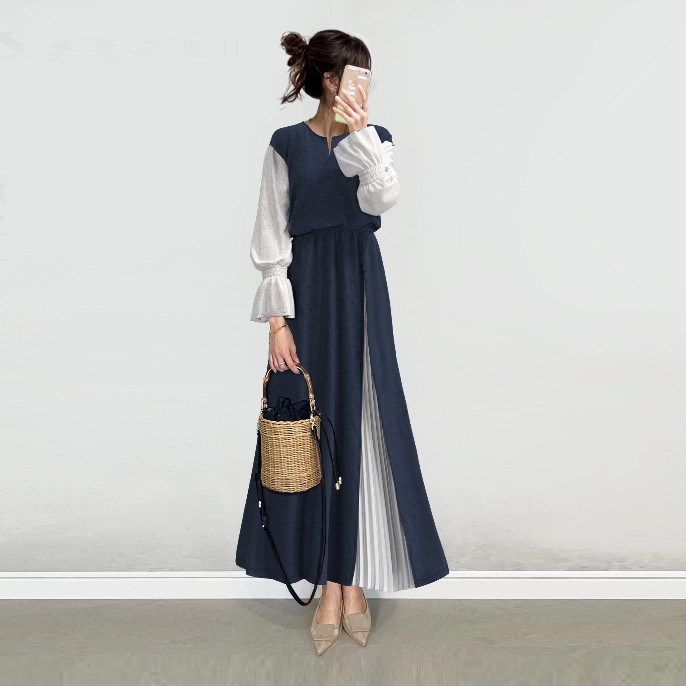 【ワンピース】大人シックな服 配色 七分袖 レイヤード S-L ロングワンピース