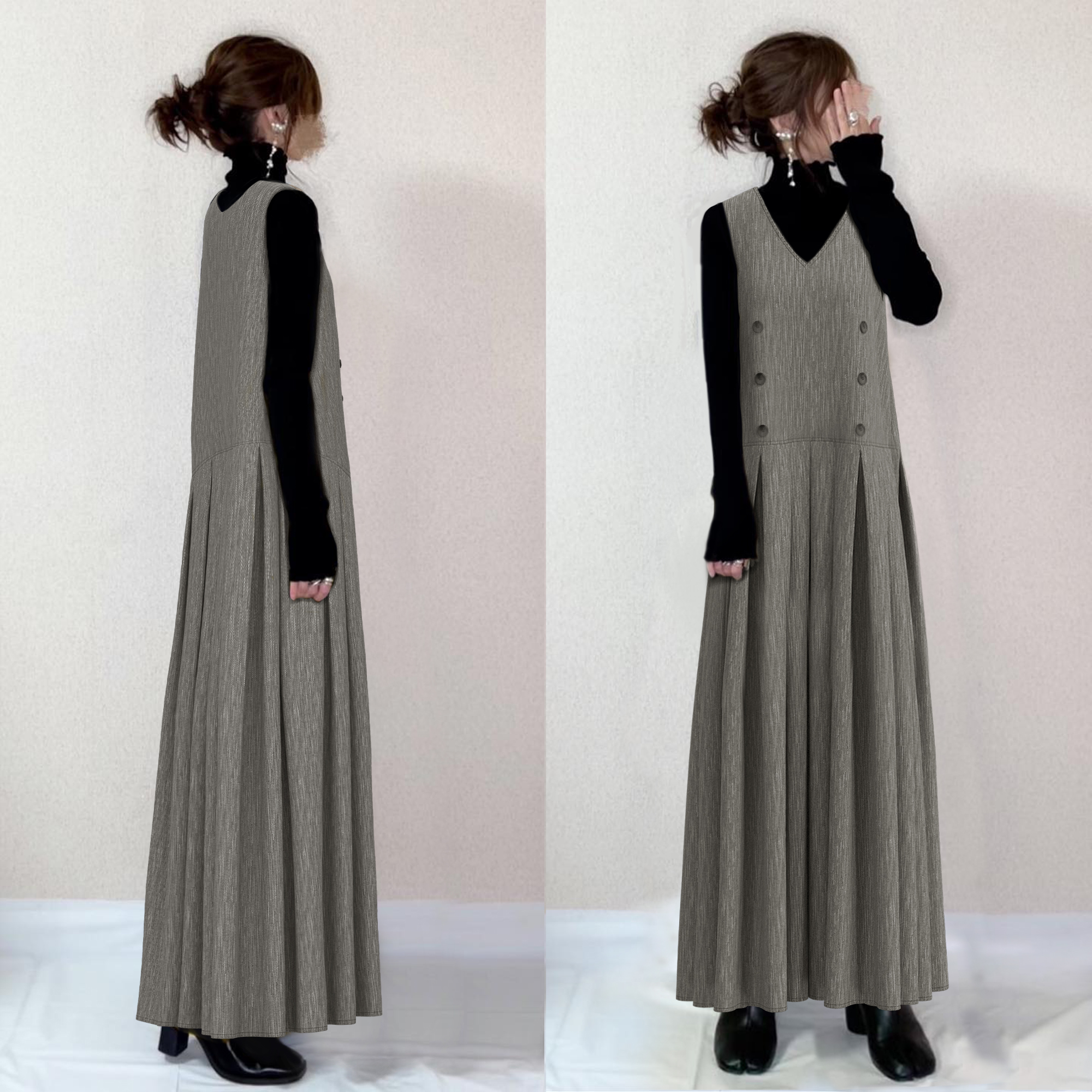 「Vネック」ハイウエスト ギャザー ノースリーブ Aライン 秋冬 シンプル ナチュラル カジュアルワンピース
