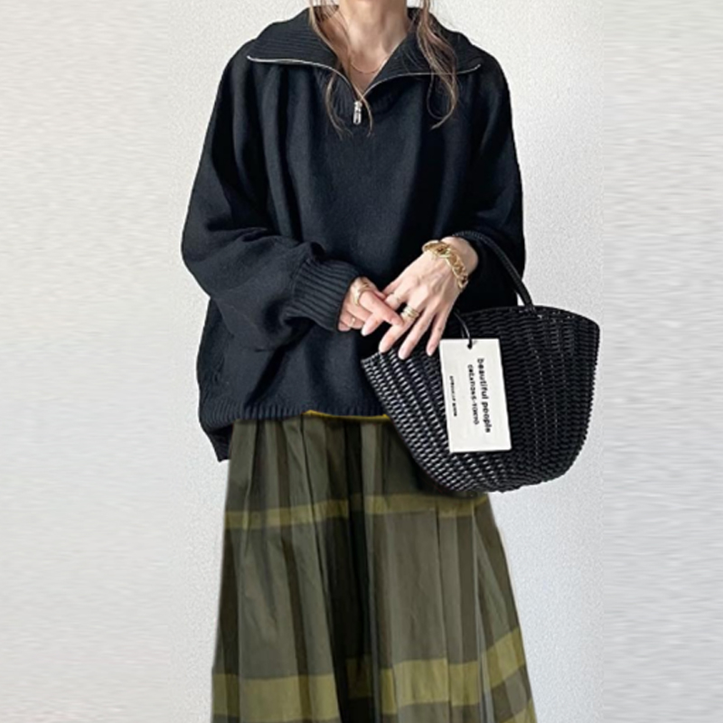 「ファスナー」Aライン 秋冬 長袖 シンプル 折り襟 ギャザー チェック柄 ナチュラル 無地 カジュアルセット