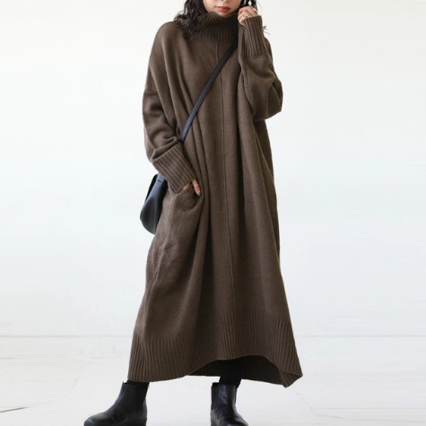 「ハイネック」シンプル プルオーバー 体型をカバー 大きめのサイズ感 レギュラーウエスト 長袖 ニットワンピース