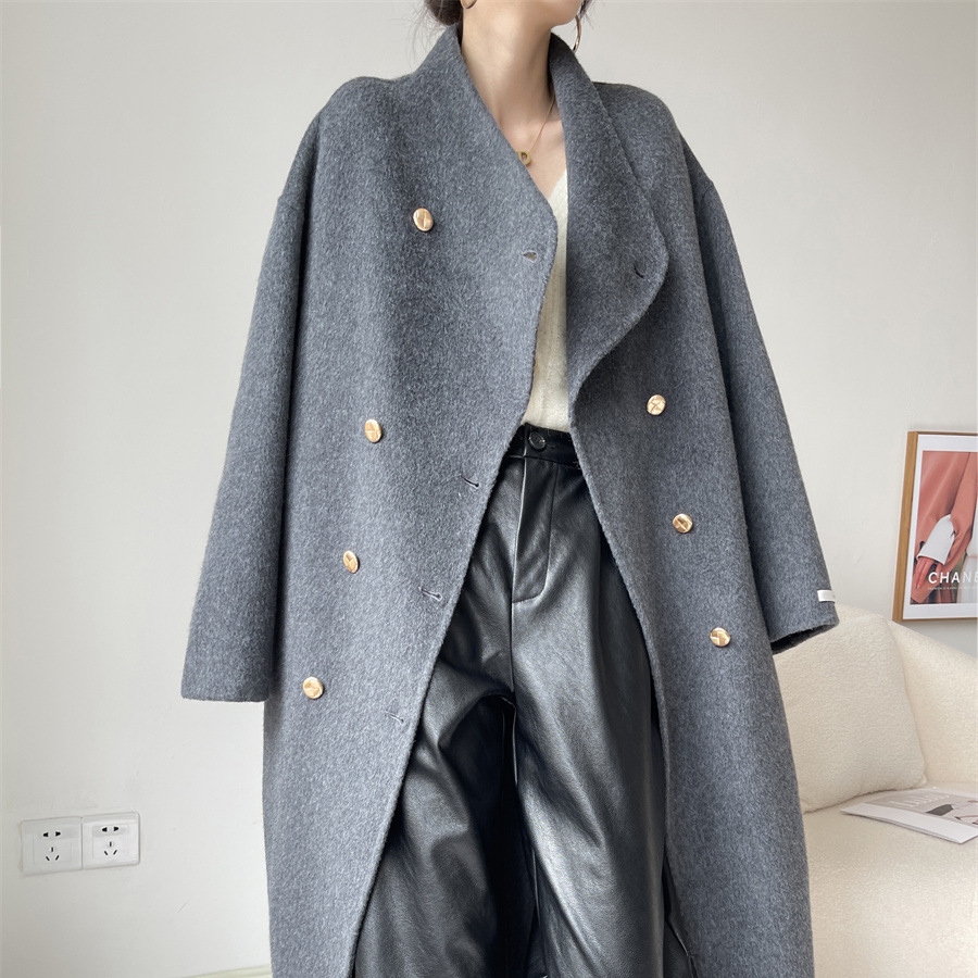 「上品見え」通勤 モード 無地 秋冬 ダブルブレスト ビックシルエット スタンドネック すね丈 コート