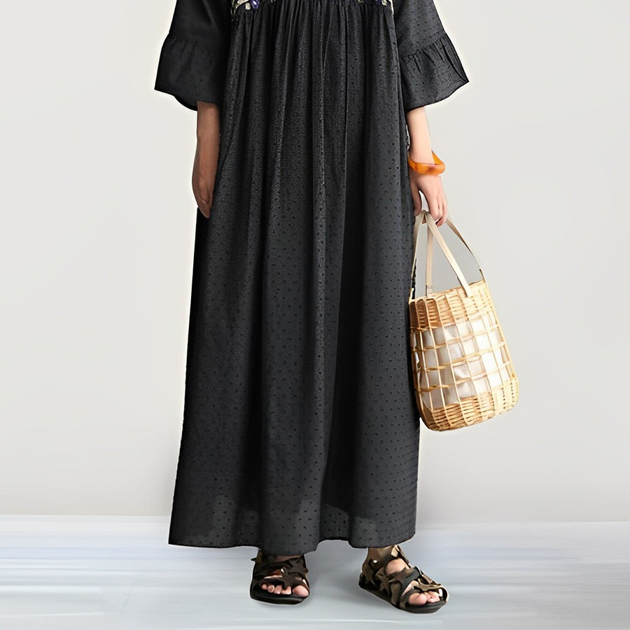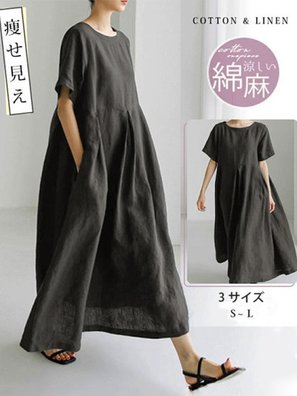 【ワンピース】着痩せ 綿麻素材 通気性良い 半袖ロング S-L ロングワンピース