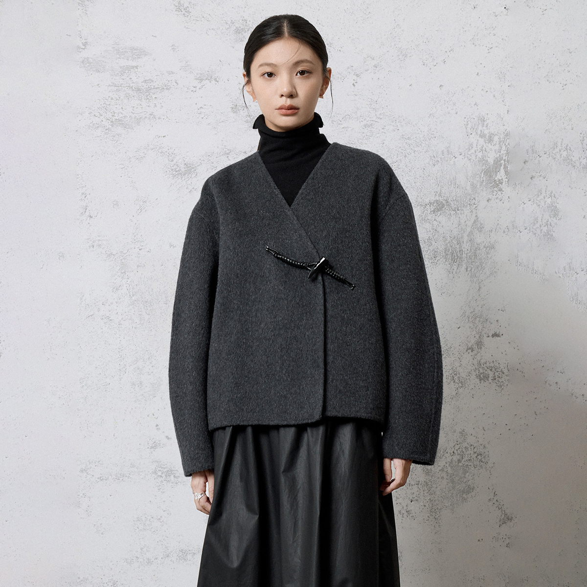 「ストラップ」秋冬 Vネック エレガント レトロ 定番 ボタン 無地 シンプル コート