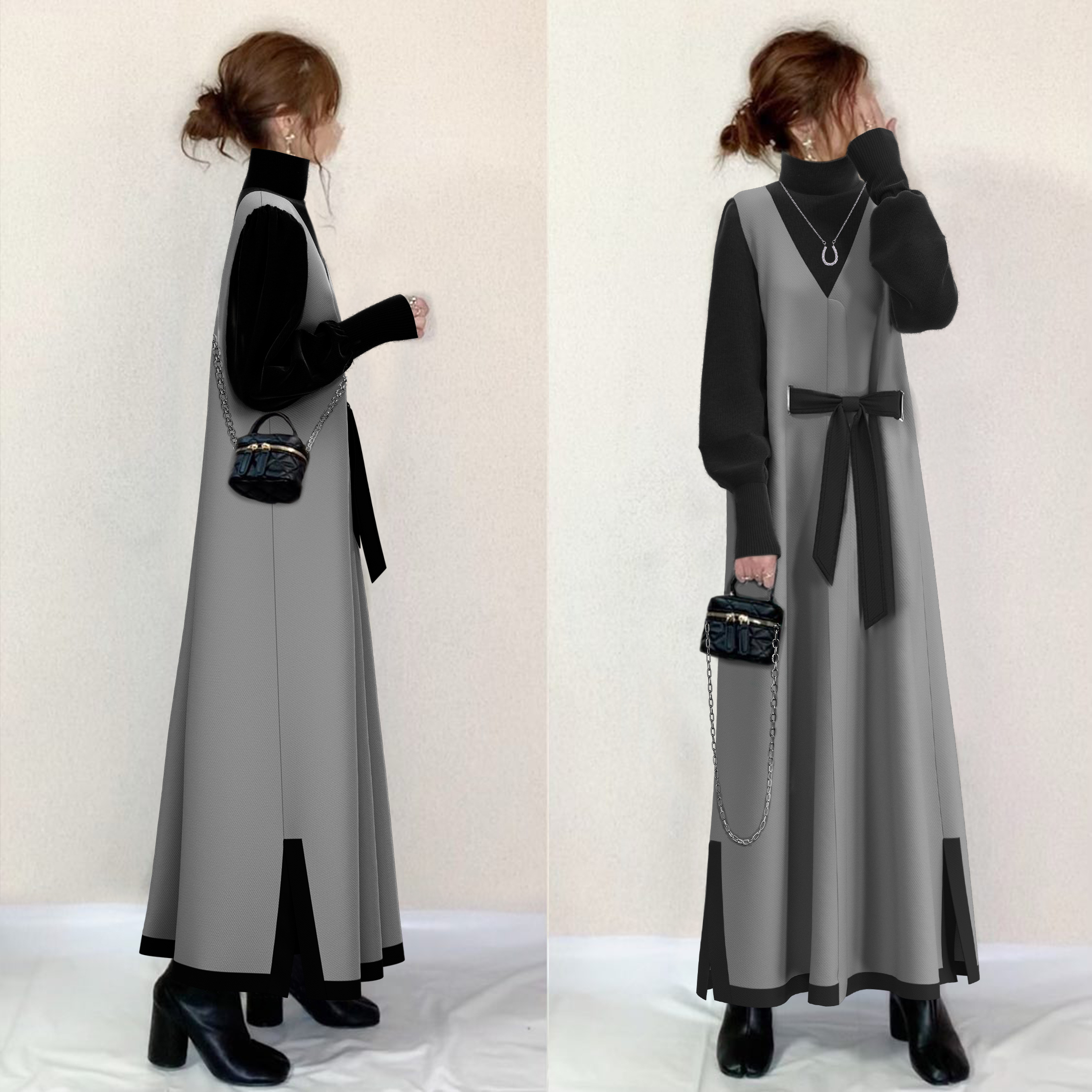 「スリット」ギャザー ベルト付き レイヤード / 重ね着風 ハイネック ナチュラル Aライン ハイウエスト 配色 カジュアルワンピース