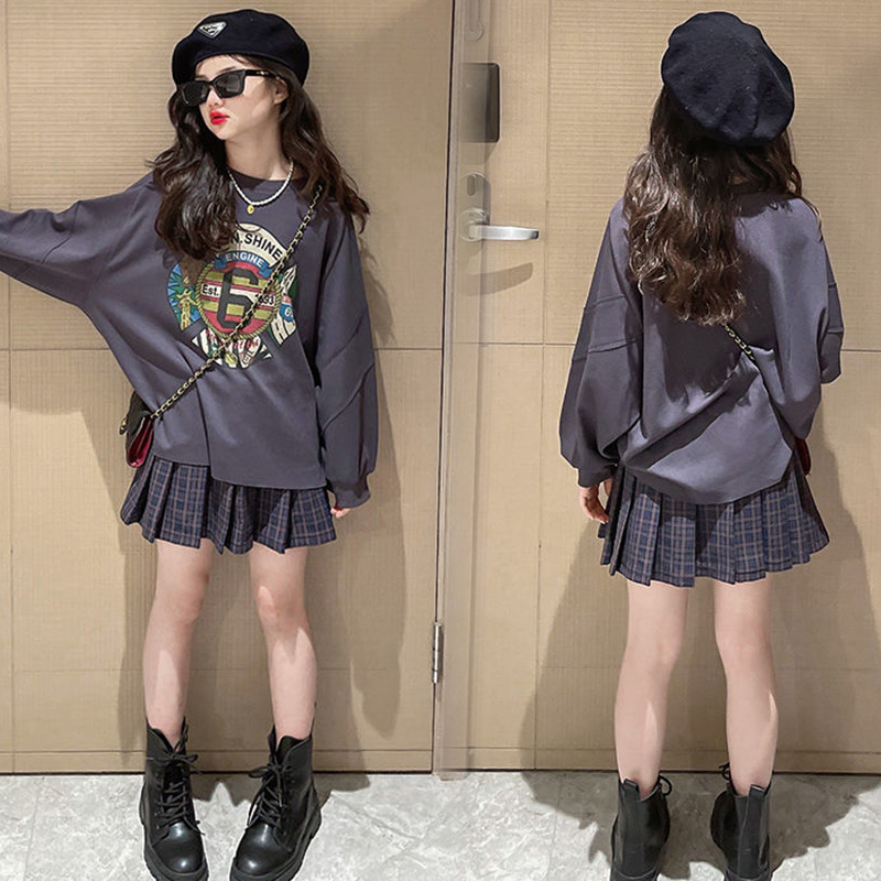 【110-170cm】デザイン性抜群 韓流 学園風 無地 プリント パーカー+チェック柄 スカート キッズ 女の子 二点セットアップ