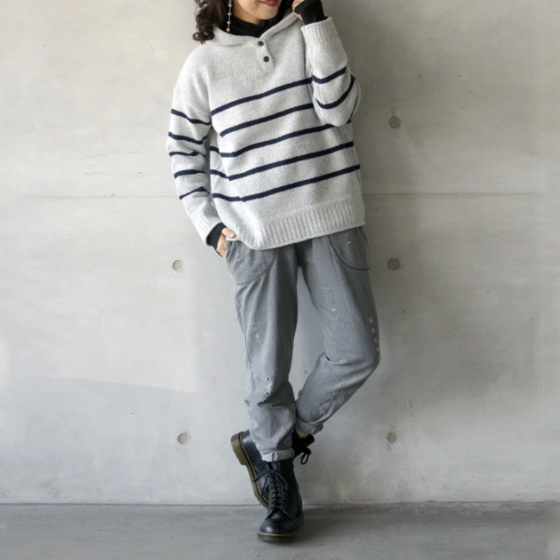 韓国で人気爆発 ボーダー プルオーバー ボタン ニットセーター