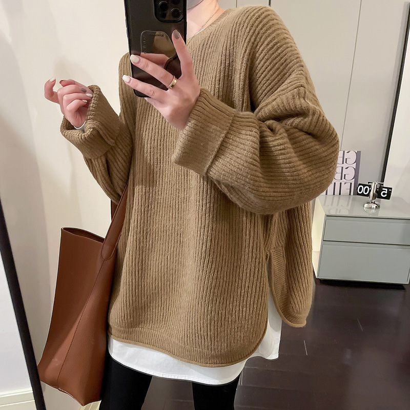 「ラウンドネック」シンプル 無地 長袖 スリット 型崩れしない ビックシルエット ニットセーター