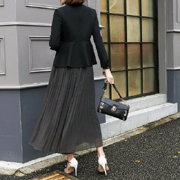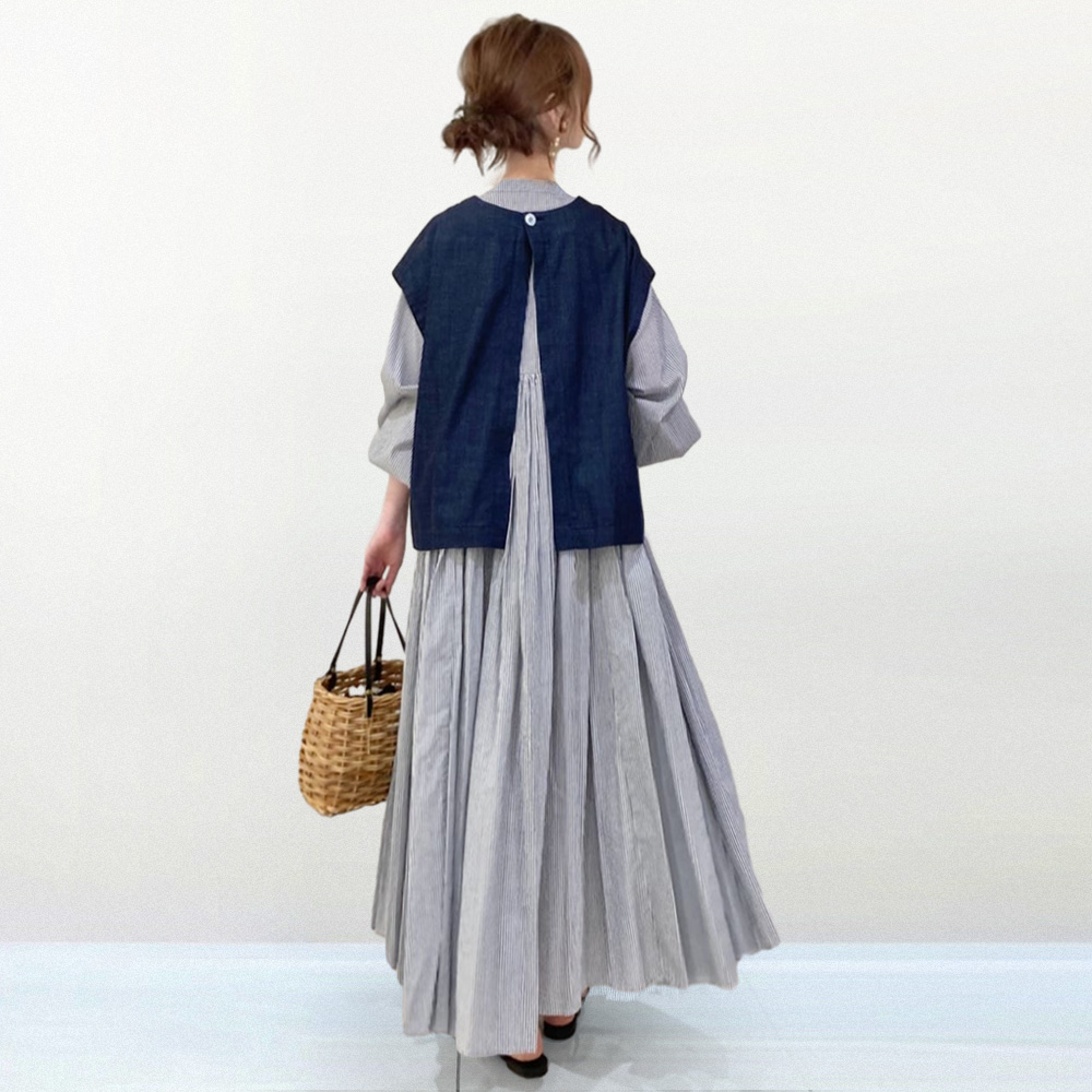 圆领后开叉马甲上衣+圆领长袖连衣裙两件套