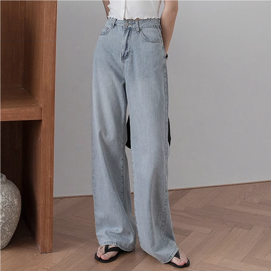 「脚長効果」ロング丈 シンプル ハイウエスト ライトブルー デニム