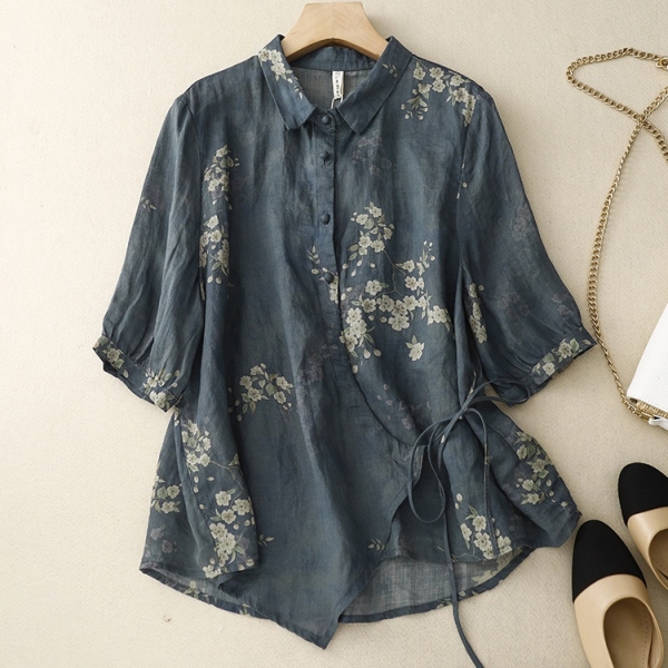 实拍2023夏装新款韩版大码遮肉印花时髦不规则气质休闲棉麻衬衫女