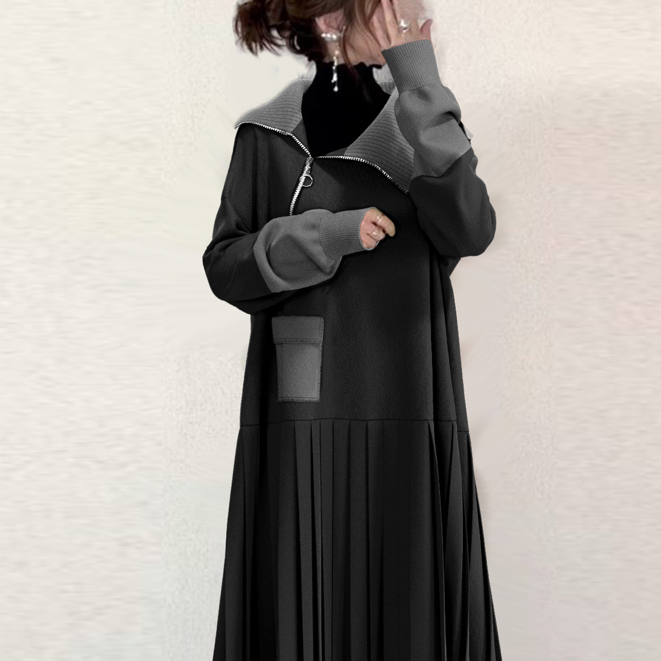 「ポケット付き」Aライン 配色 ファスナー ギャザー 折り襟 秋冬 カジュアルワンピース