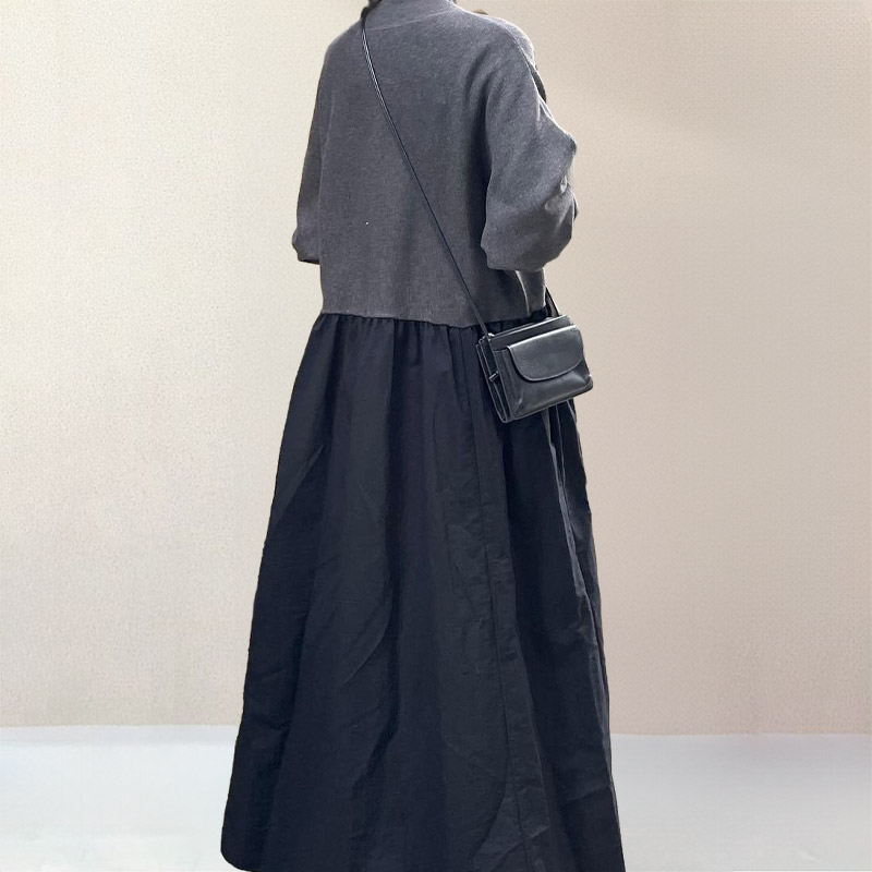 「ハイネック」ボールガウン 切り替え ギャザー 配色 ハイウエスト 長袖 秋冬 シンプル ナチュラル カジュアルワンピース