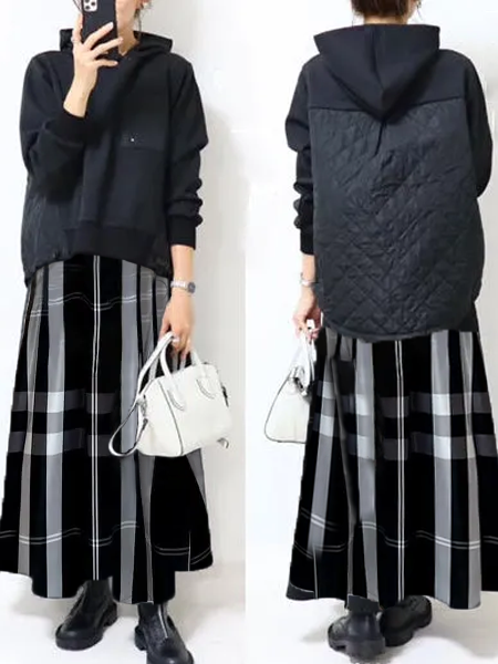 【二点セット】 無地 着痩せ効果 長袖 シンプル トップス+ チェック柄 スカートセット