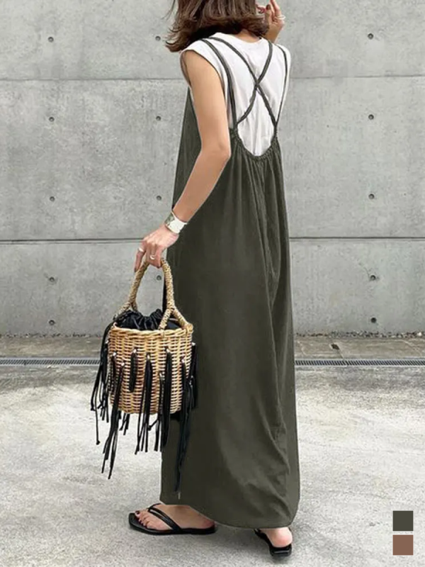 【ワンピース】 新品殺到 ノースリーブ ギャザー 綿麻 ジャンパースカート