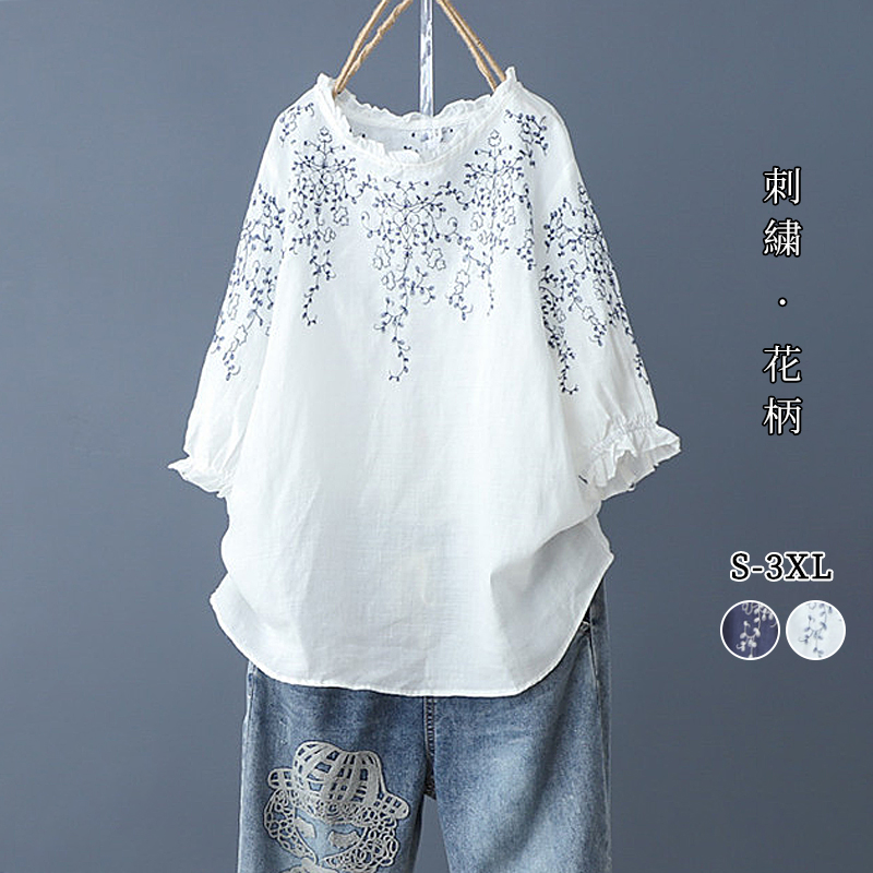 2020年夏季日系刺绣亚麻复古短袖灯笼袖棉麻上衣女装碎花苎麻t恤
