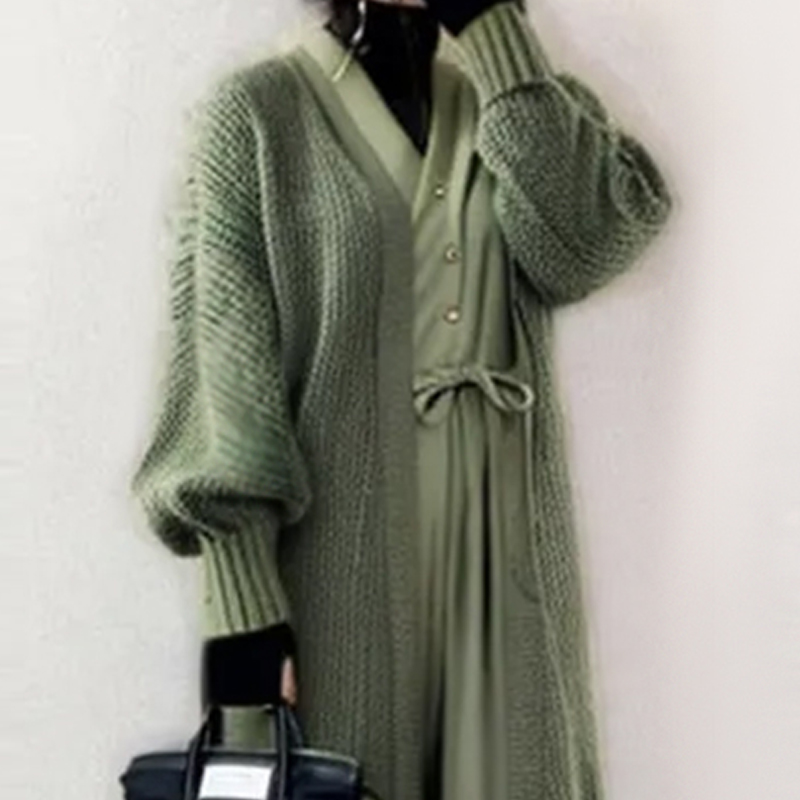 「ランタンスリーブ」レイヤード Vネック ストレートスカート グリーン ニットワンピース
