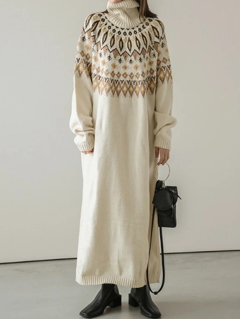 ファッション プリント ロング ハイネック カジュアルワンピース