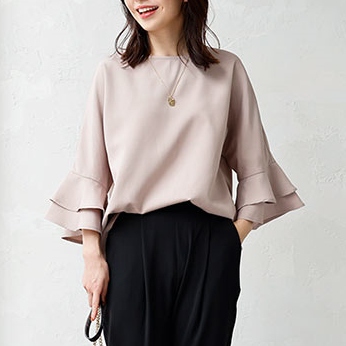 無地 九分袖 エレガント フリル袖 ラウンドネック ブラウス