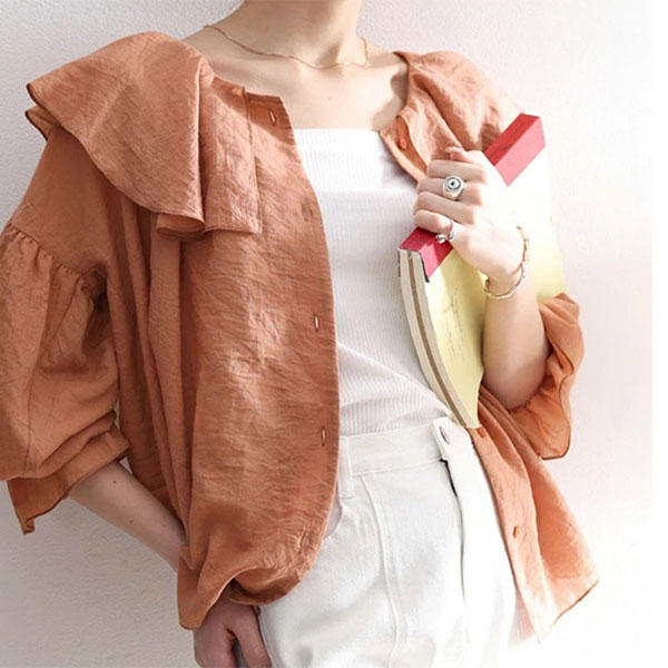 おしゃれ度高め 無地 フリル 七分袖 シングルブレスト カーディガン