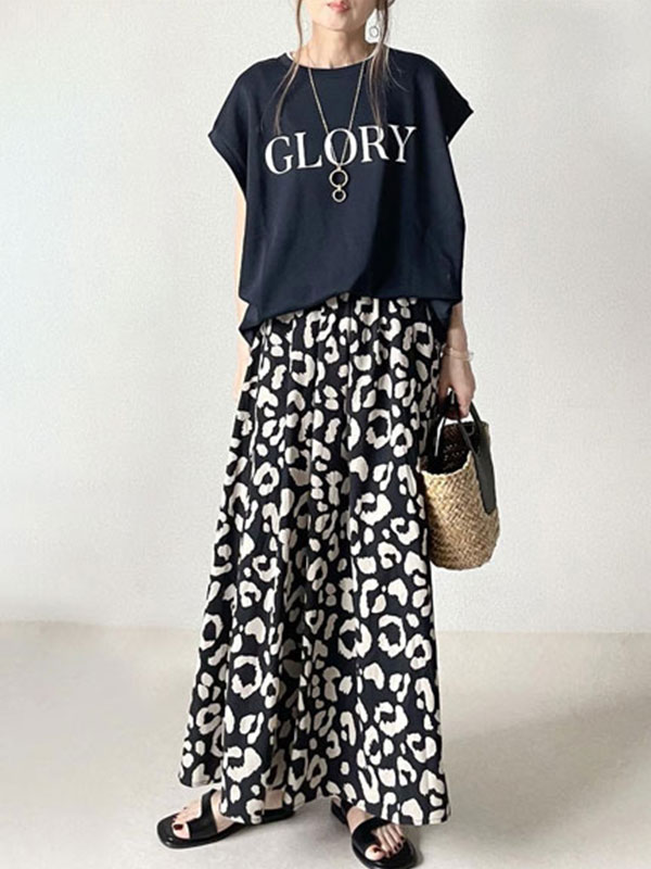 女性に大人気 ラウンドネック Tシャツ プリント ロングスカート S-L 2セット