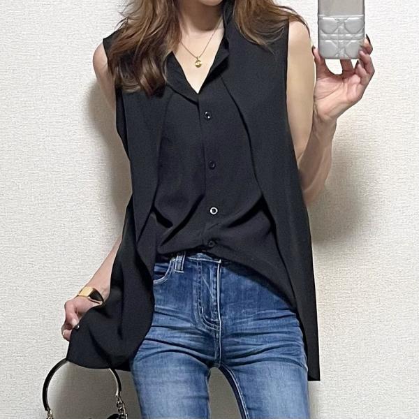 【トップス 】人気高い フェイクツーピース スタンドカラー ノースリーブ S-Mシャツ