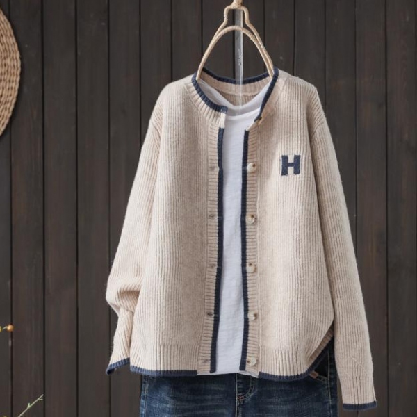 「アルファベット」ボタン ラウンドネック シングルブレスト 4色選べる 長袖 カーディガン