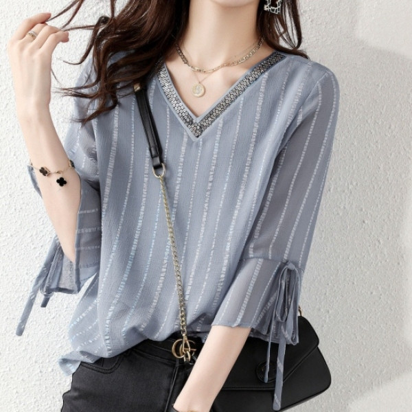 「Vネック」ストライプ柄 七分袖 ボウタイ 切り替え ブラウス